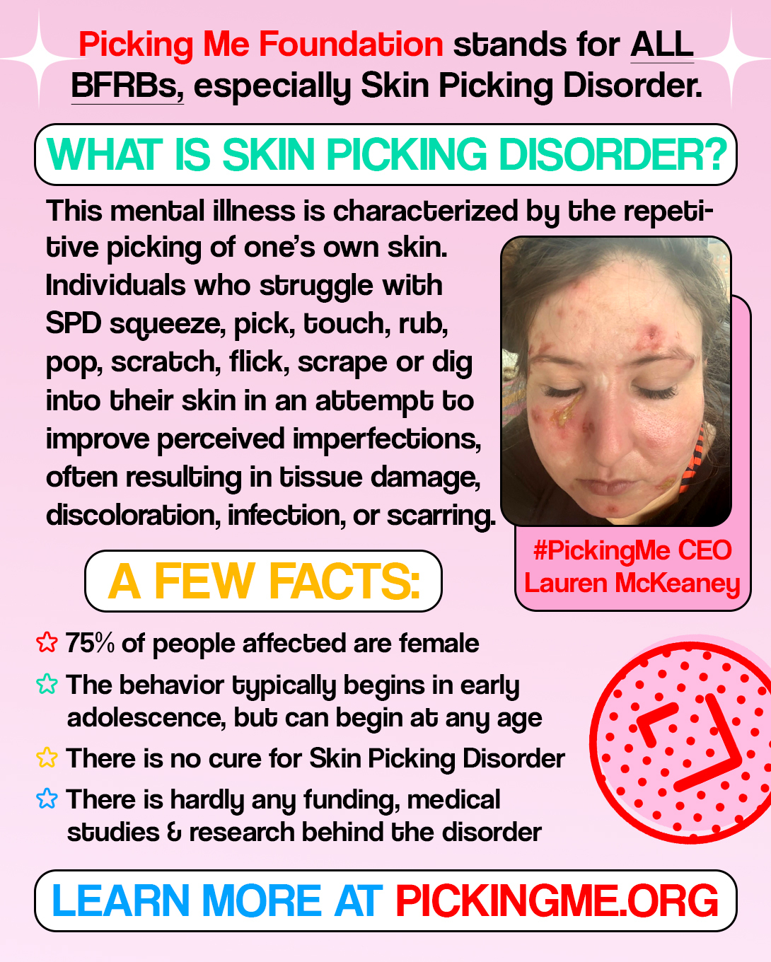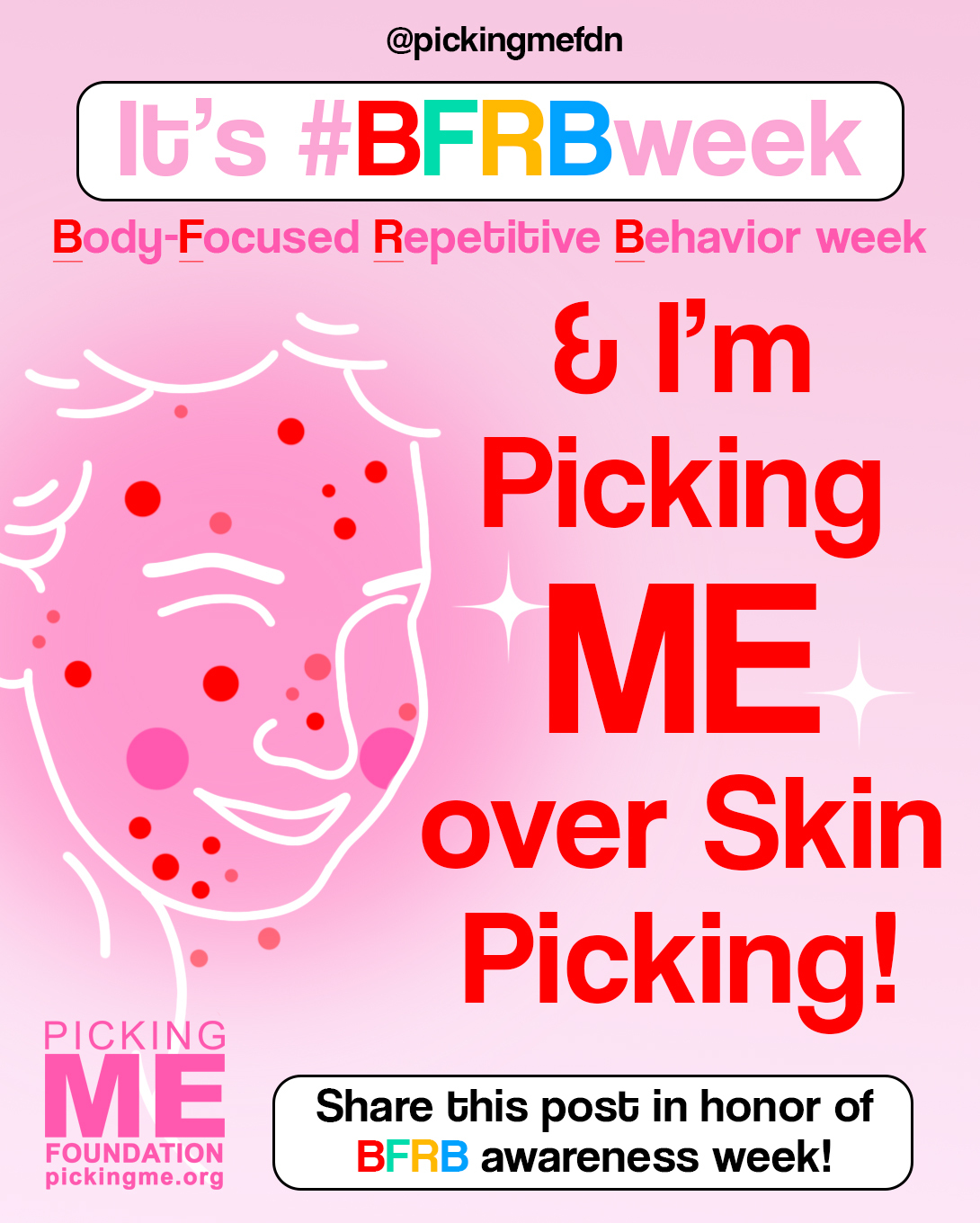 “Don’t judge. Don’t grimace if you see a spot or point it out. We’re well aware of how we look, but you’re not aware of how it makes us feel. Don’t lecture or scold. Don’t ask us why we can’t ‘just stop’. We don’t understand it either and we wish we could. Don’t smack our hands away from our body. Distract us. Ask what’s got us wound up. We may not always know, but it’ll help us to redirect the energy. Or, just keep it all to yourself and simply support us. #PickingMe has shown me that I'm not alone and that there are people trying to help us.” -@mrsvon08 What does #SkinPickingDisorder support look like for you?