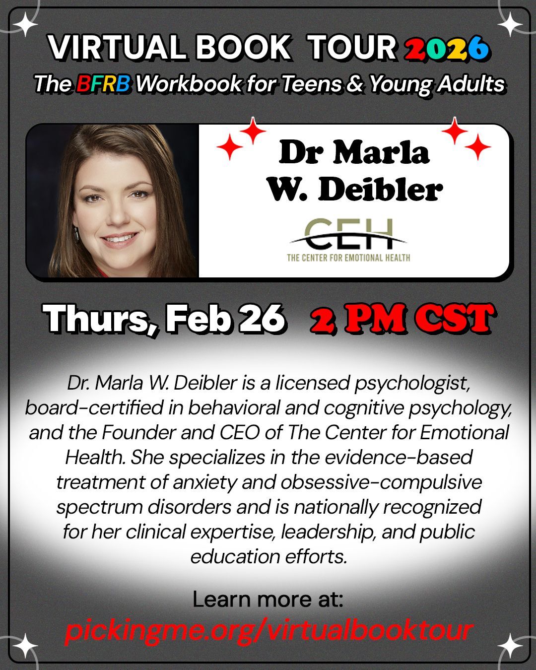 Join Picking Me Foundation's Lauren McKeaney and The Center for Mindfulness & CBT's Dr. Laura Chackes virtual book tour promoting their new publication The BFRB Workbook for Teens & Young Adults alongside fellow #BFRB leaders.
