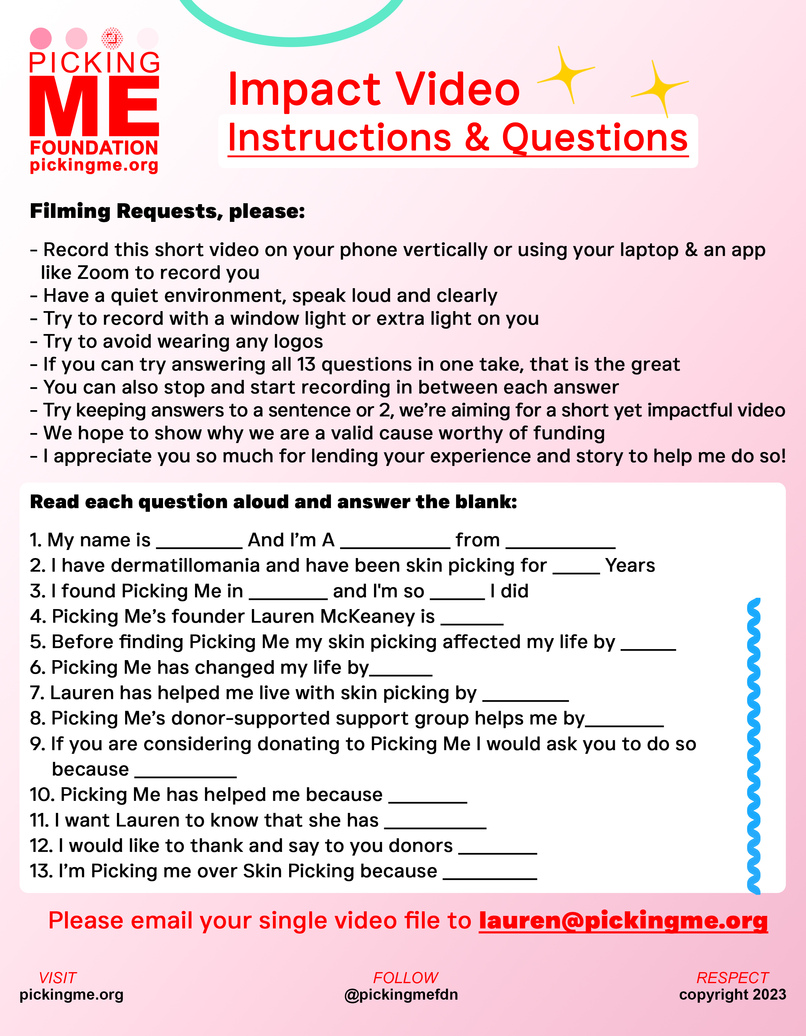 So please find a quiet, well lit space, wear no logos, speak loud and clear, and record yourself on Zoom or your phone vertical answering the list of questions below. Then send the file via WeTransfer to lauren@pickingme.org or fill out our online form here. Thank you so much fam!