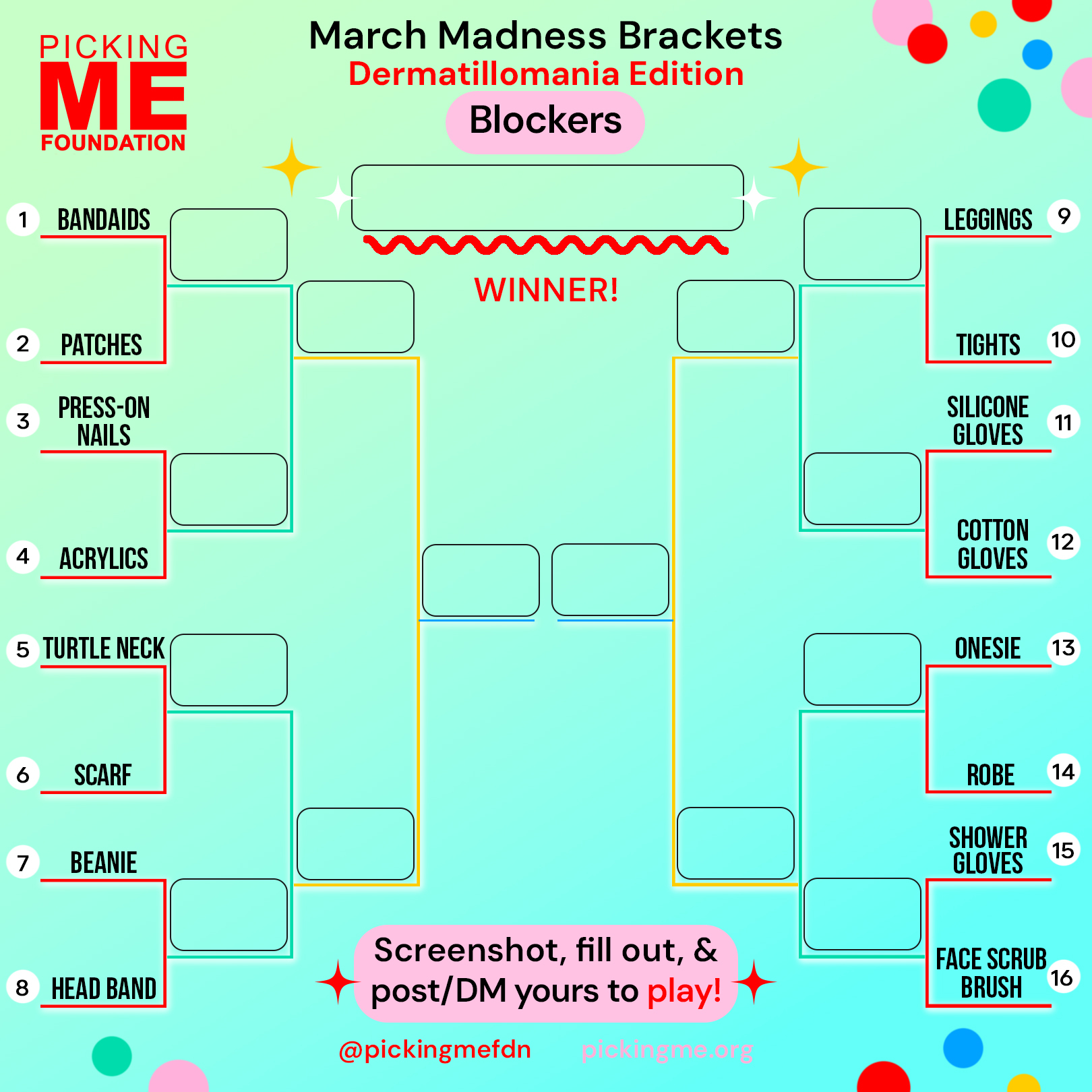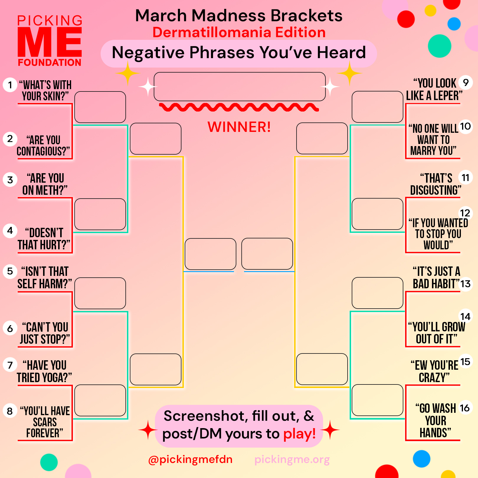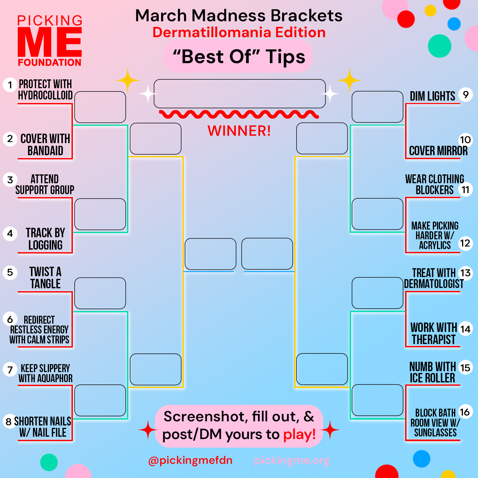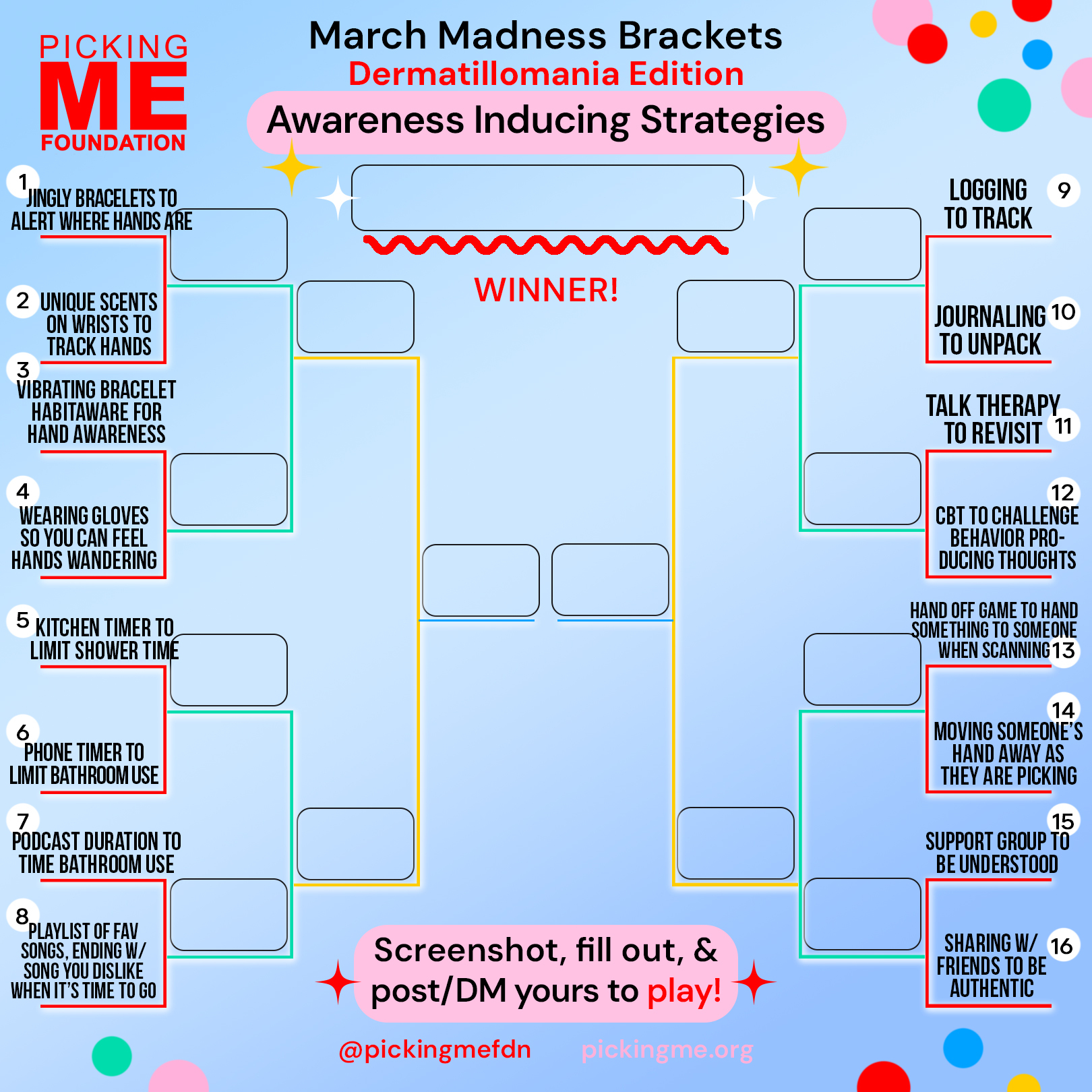 Take part in our March Madness Dermatillomania brackets! We've compiled relatable categories from our community to make the ultimate Skin Picking Disorder brackets.