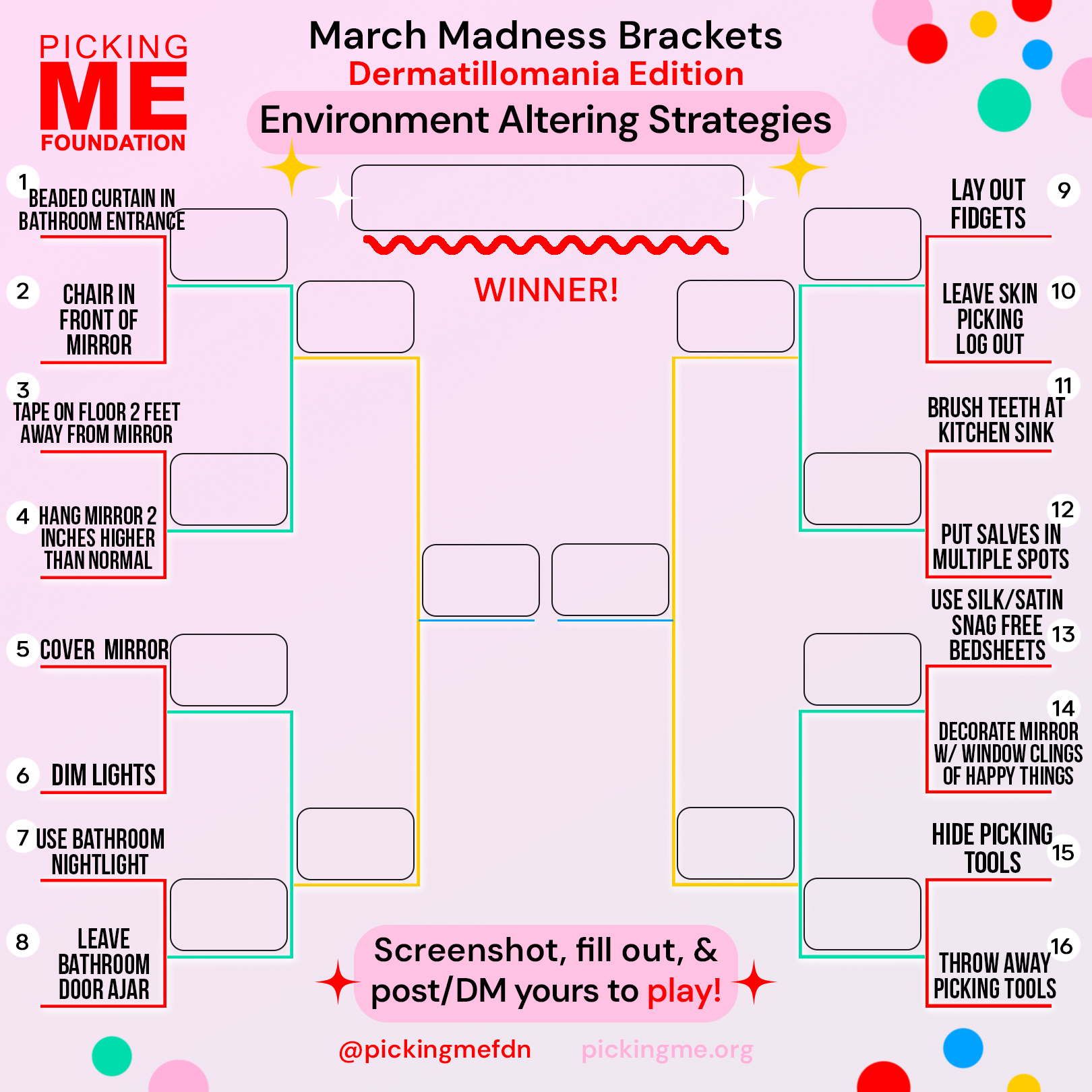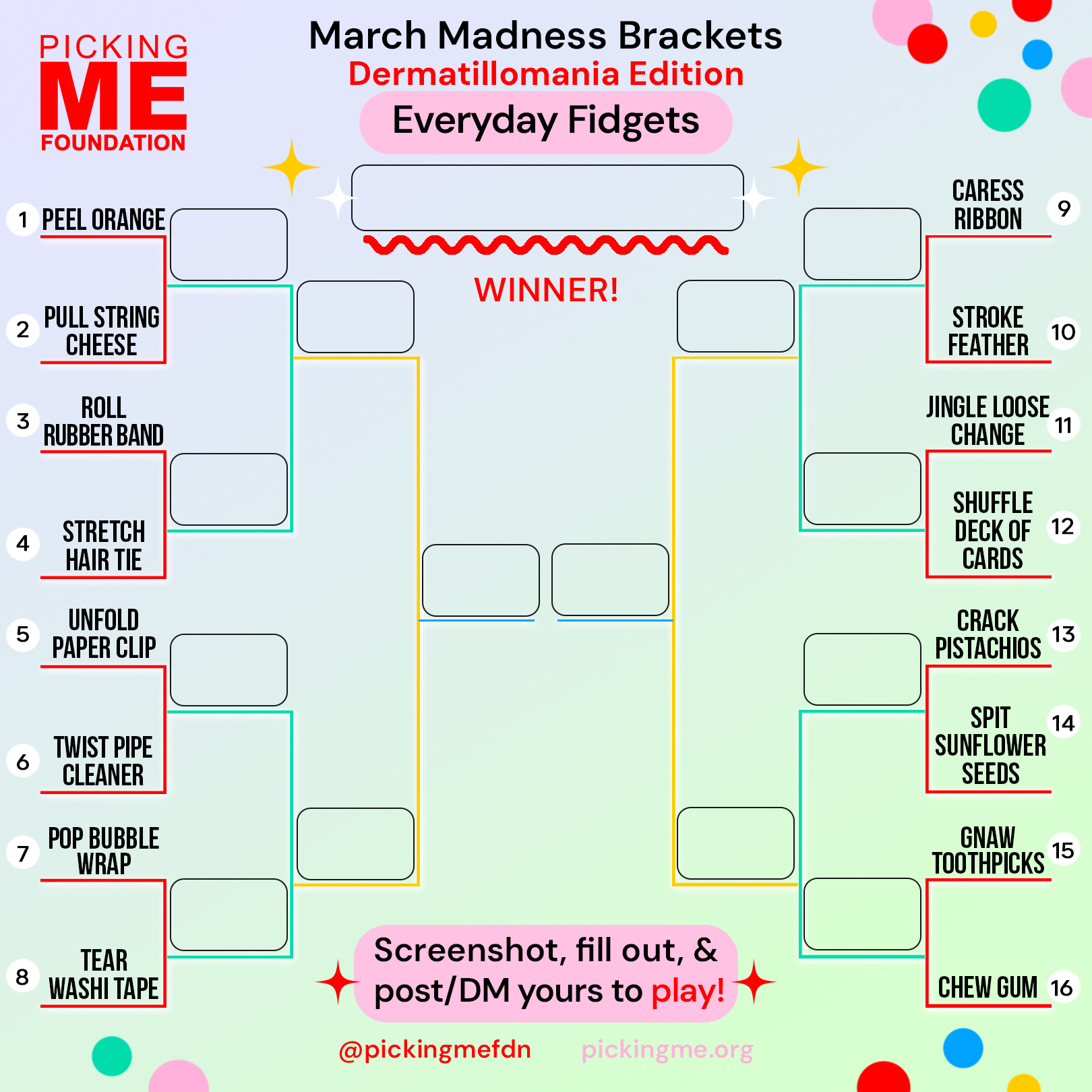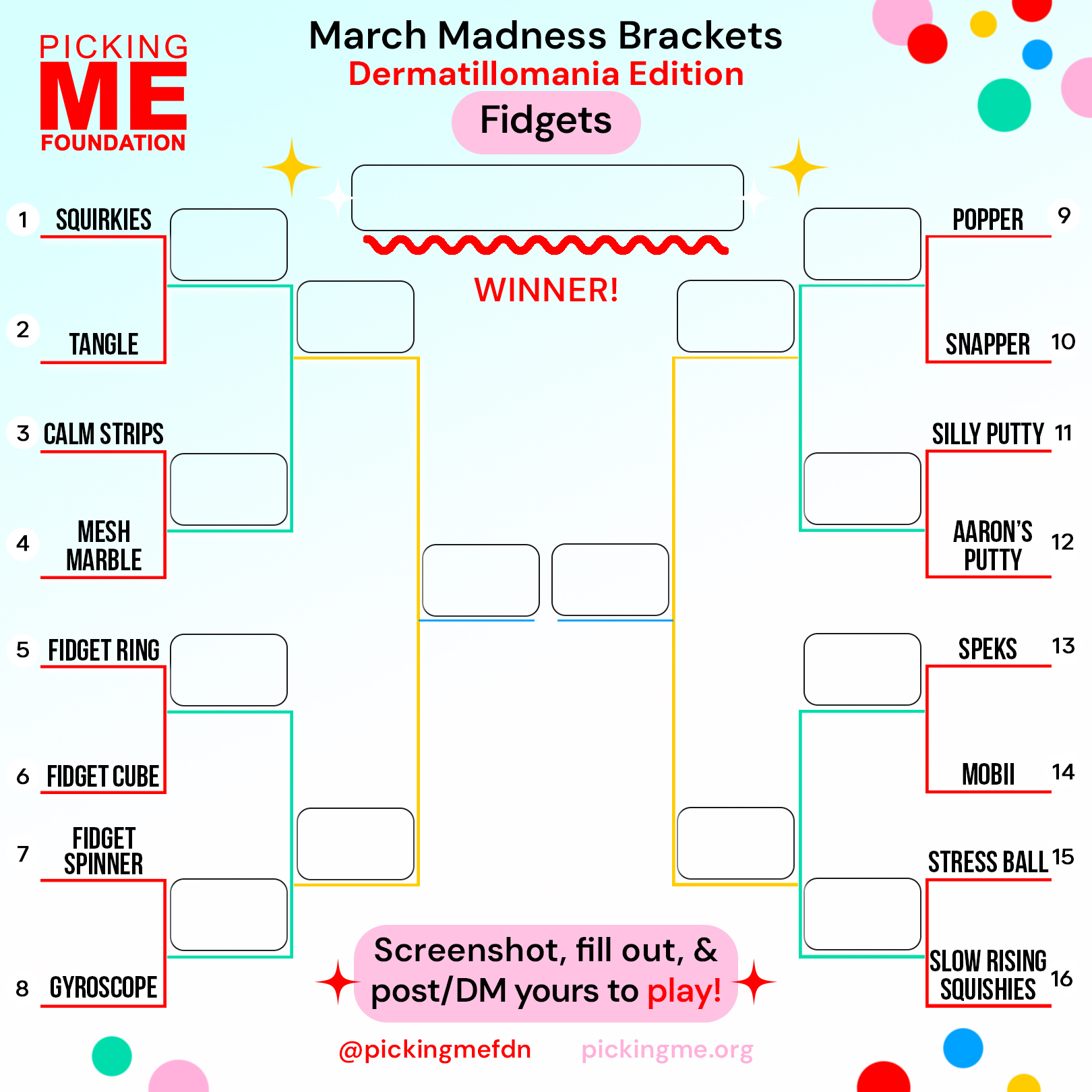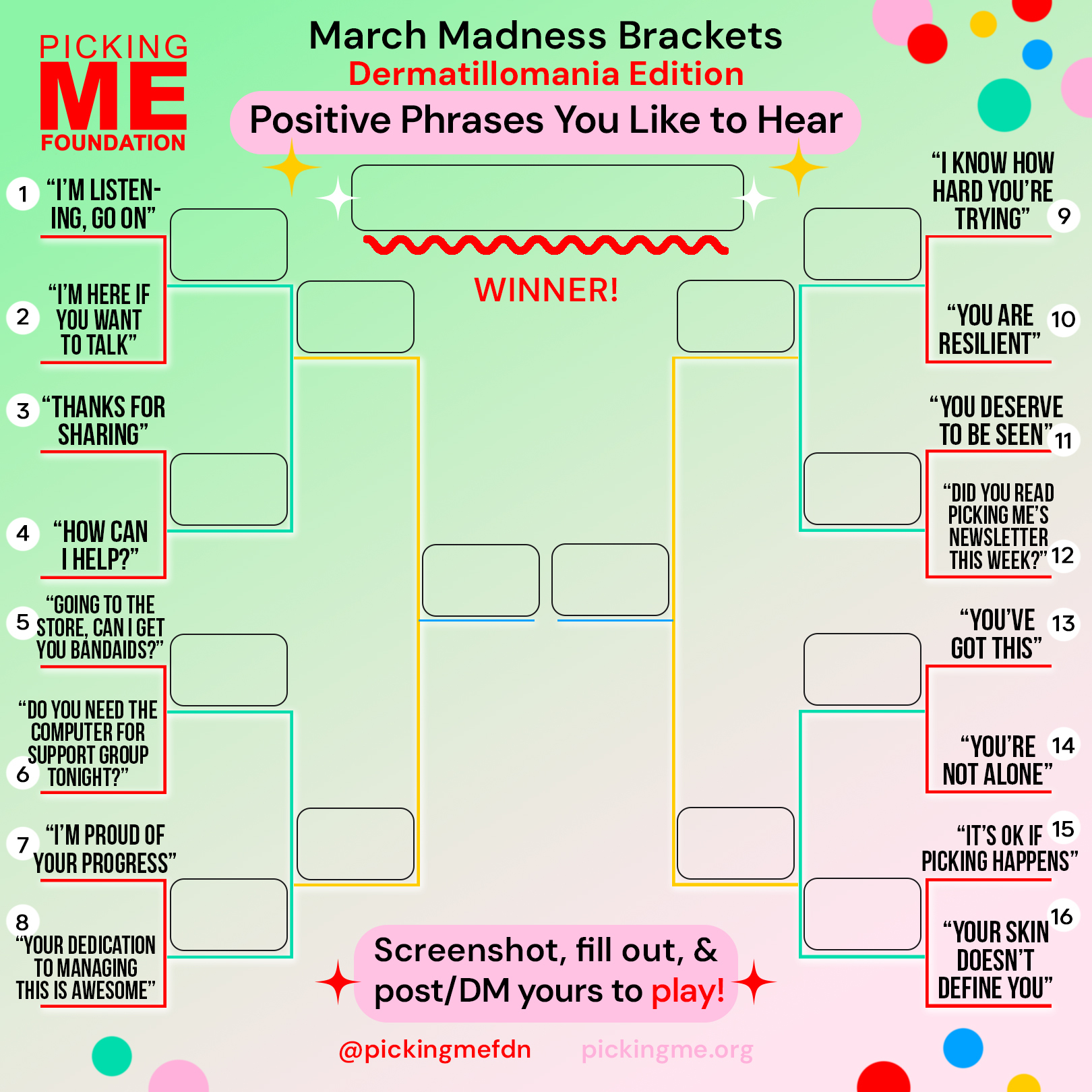 Take part in our March Madness Dermatillomania brackets! We've compiled relatable categories from our community to make the ultimate Skin Picking Disorder brackets.
