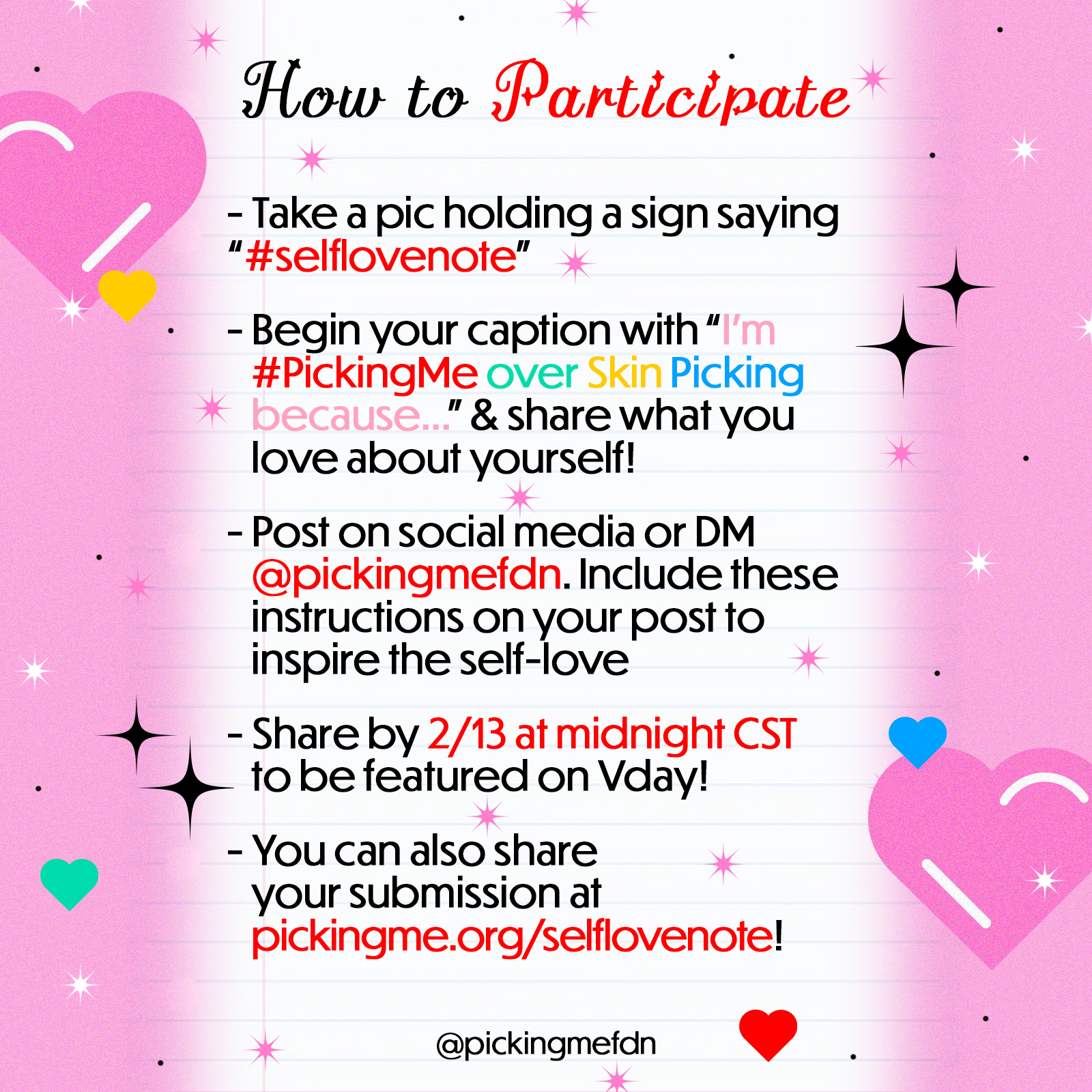All you have to do is take a picture, from now till Feb 13, midnight CST, holding a sign that says #selflovenote. Then in the caption, starting with "I'm #PickingMe over Skin Picking because," share what you love about yourself! It can be anything from "I love the way I make ice cream sundaes" or "I love how reliable of a friend I am," or "I love the skin I'm in," YOU decide!